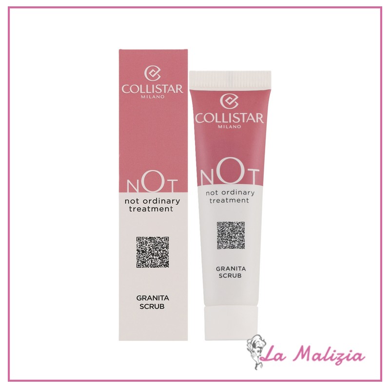 Collistar NOT Granita scrub, ideale per labbra e contorno labbra, ha una texture zuccherina e profumata che esfolia la pelle delicatamente e rimuove efficacemente le piccole pellicine nelle zone secche e screpolate, lasciandola morbida e levigata, rinnovata e idratata con un solo gesto, soddisfacente come assaporare una granita! Con l’87% di ingredienti di origine naturale, GRANITA SCRUB avvolge la pelle con un blend di zuccheri dai granuli di dimensioni diverse che, agendo all’unisono, rinnovano la cute. Una formula arricchita da un attivo italiano e sostenibile, l’Estratto di Lampone dalle proprietà idratanti e lenitive e preventive anti-age, e dall’Olio di Nocciolo di Ciliegia, che levigano e idratano la pelle. NOT – GRANITA SCRUB è stata formulata senza siliconi e senza derivati di origine animale. La sua formula waterless è anche priva di alcol, per adattarsi a tutti i tipi di pelle, con la massima tollerabilità. Lo scrub, arricchito con un Estratto di Lampone dalle proprietà idratanti e lenitive, aiuta a prevenire i danni da stress ossidativo ed esplica una funzione anti-età, oltre a proteggere e a riparare il DNA cellulare.